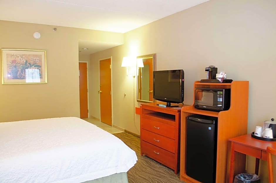 Any corresponding photo may not reflect the specific accessible room type or room feature. This mobility and hearing accessible, nonsmoking room features one king sized bed , and an accessible bath tub. The room also has a visual alarm and notification devices for the doorbell or door knock and incoming phone calls. The room features comfortable soft seating, microwave, refrigerator, a 32 inch flat screen HDTV, and easy to operate alarm clock/radio. The free high speed internet access will help you stay connected while on the road. If you prefer not to work at the desk, you can use the convenient lapdesk instead. You'll also enjoy the convenience of having a coffee maker with tea service and iron/ironing board in your room.